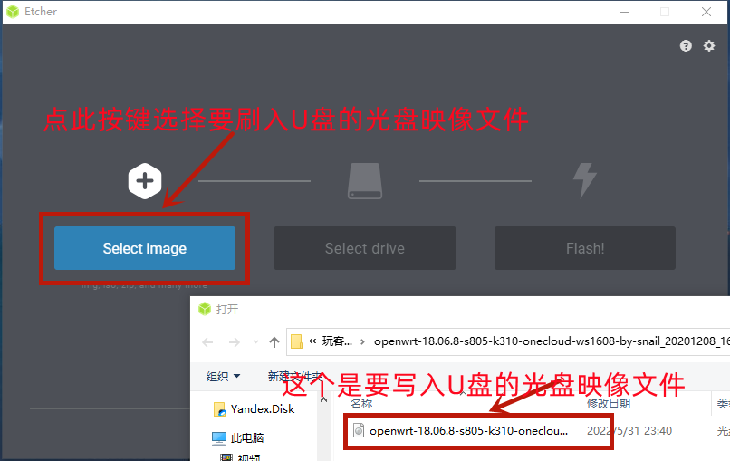2.打开“balenaEtcher-Portable-1.5.45.exe”这个软件,点击红色方框,在接下来的窗口选择刚刚解压出来的光盘映像文件。