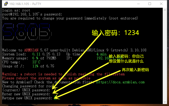 第四步,putty链接玩客云,(用户名:root,密码:1234)