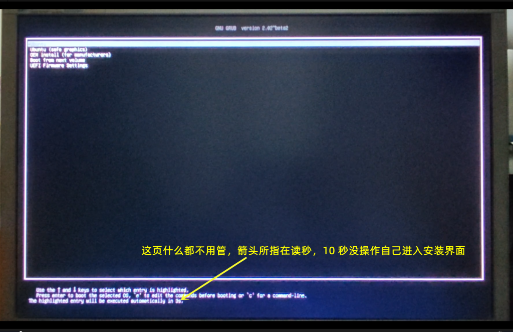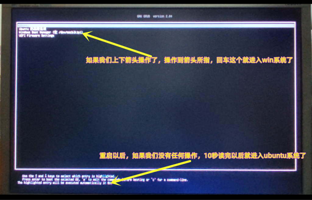 重启以后如果我们什么都不动,10秒读完就会进入ubuntu系统了,如果10秒没读完,我们按上下箭头键来调整要启动的系统。