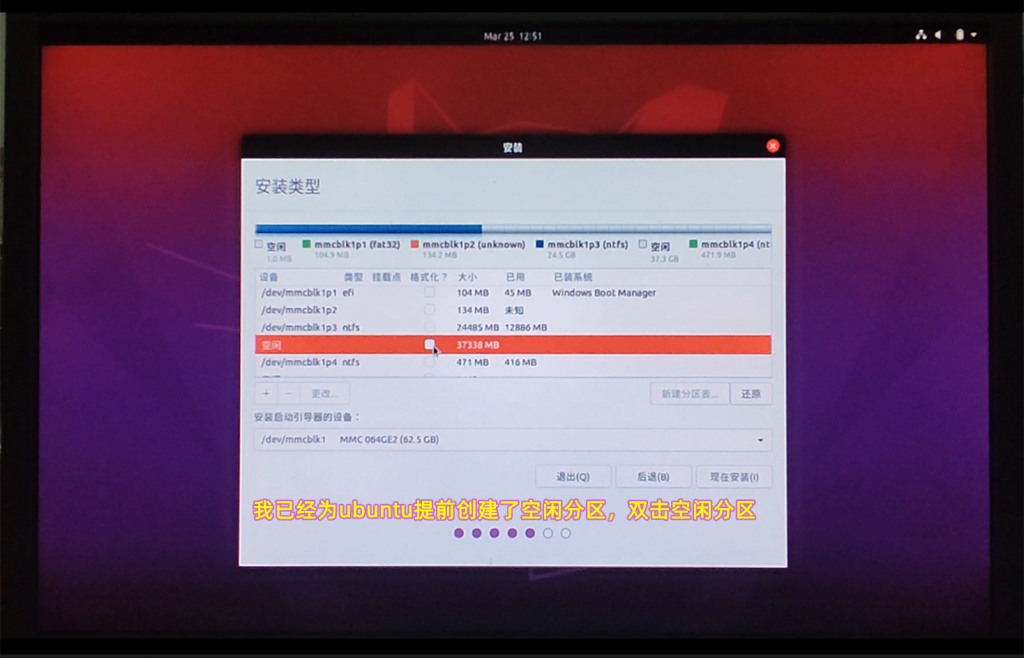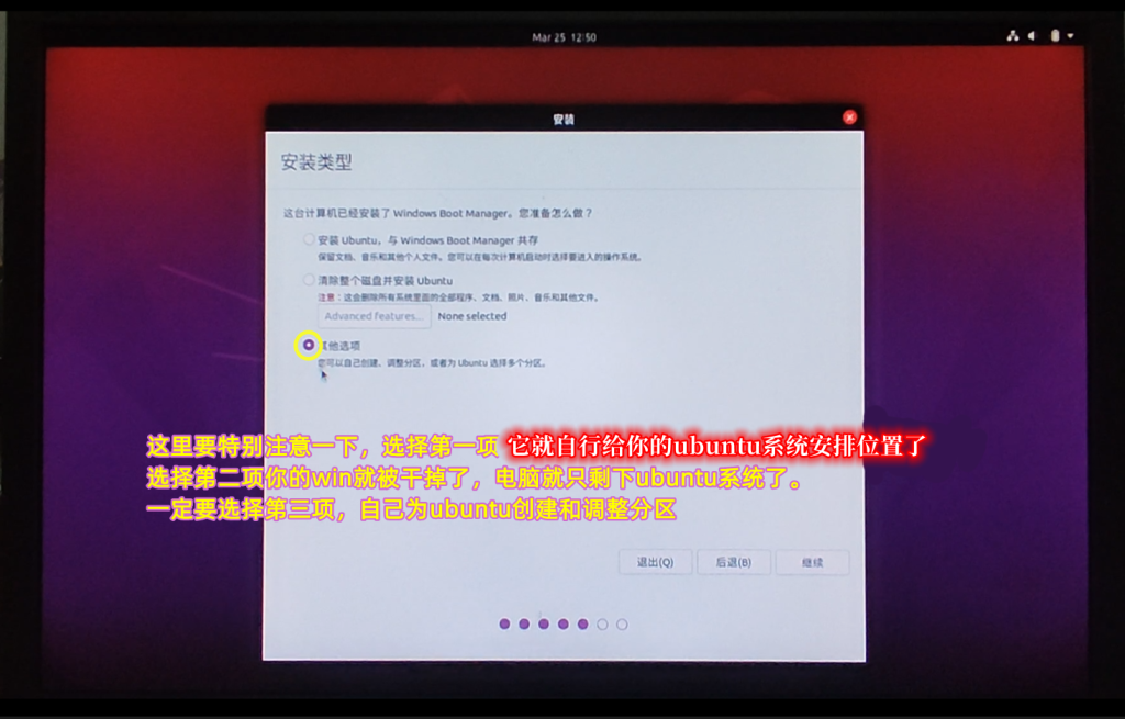 双击提前为一定要选择第三项,自己为ubuntu创建和调整分区。准备好的空闲分区。