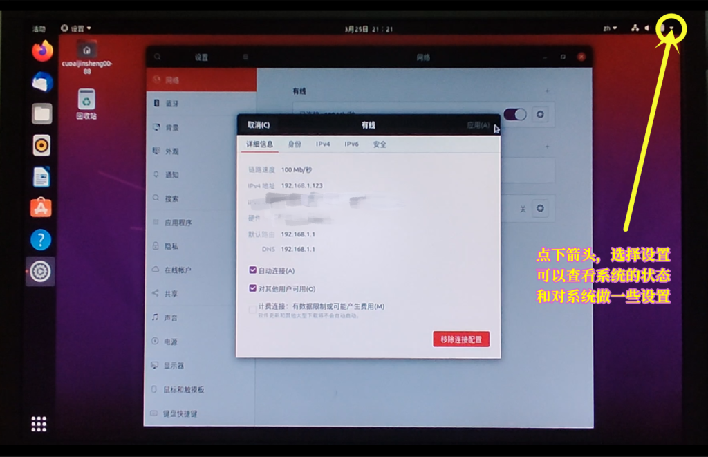 点击右上角的箭头,设置里可以查看电脑的一些状态,在设置里也可以对电脑做一些适合自己的个性化的修改。开关机重启也都在箭头里。