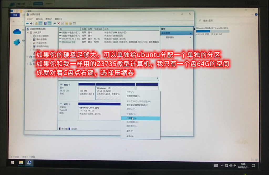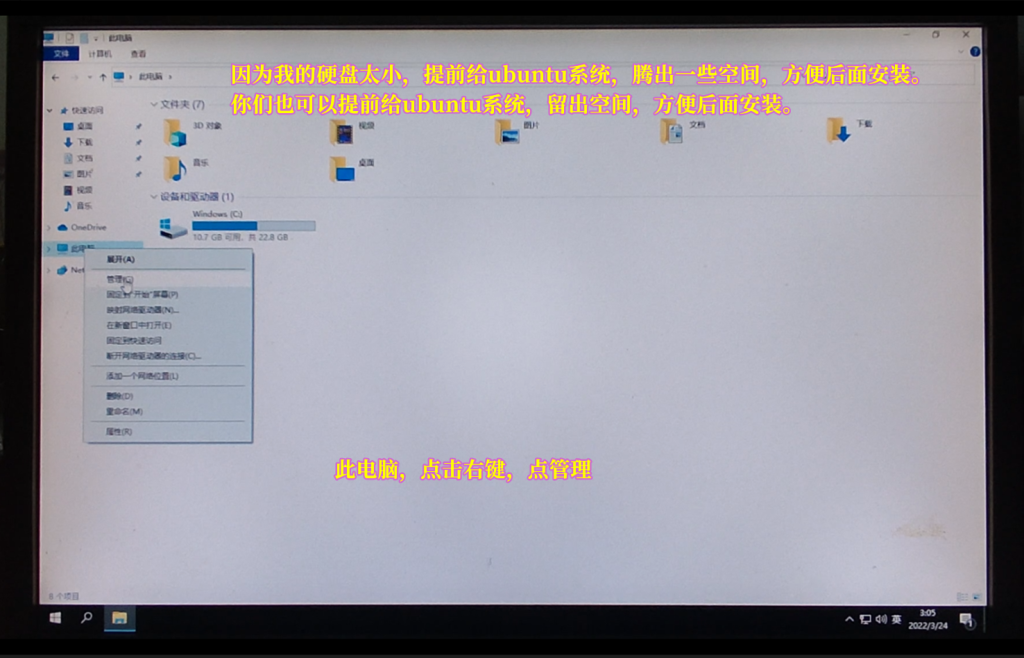 第三步,提前给要安装ubuntu系统的电脑,在硬盘上给ubuntu系统预留空间