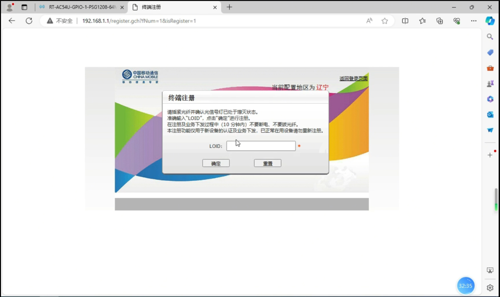 1,设备注册。浏览器地址192.168.1.1,直接点击设备注册,输入你保存好了原光猫的LOID,点击确定,然后等待设备注册(如下图)