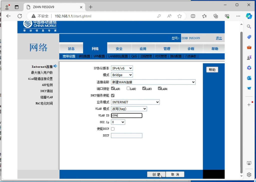 IP协议选择IPV4/IPV6—-连接模式选择桥接Bridge—-端口绑定LAN口建议都选上—-业务模式选择Internet—-VLAN模式选择改写—-VLAN ID填写你保存的数字—-然后保存修改