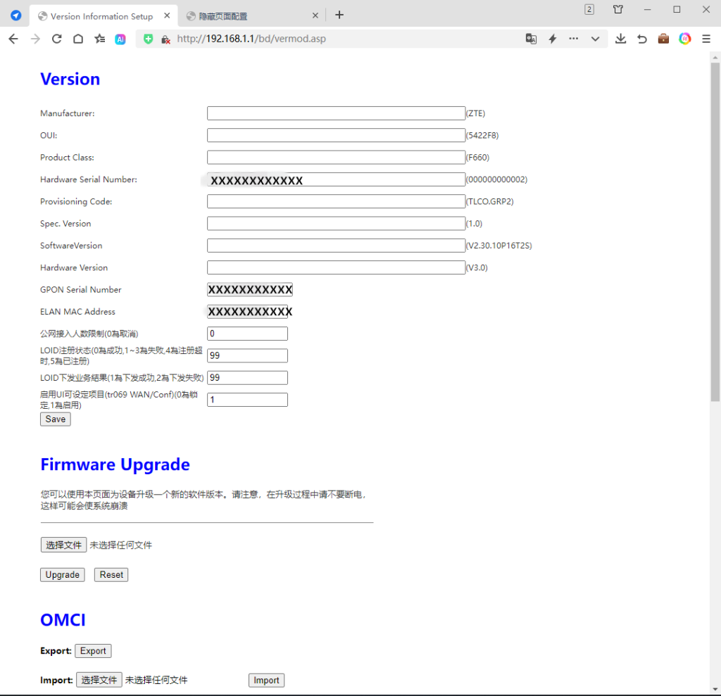 关于光猫一侧的AP模式:这个就不多记录了,进光猫后台以后所有网络连接模式都试验了,始终没能连接网络。于是想着修改光猫的参数,看看能不能在我们这里注册使用。