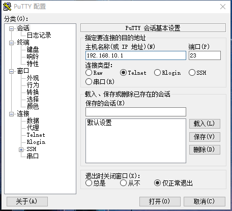 3.打开telnet工具,这里我用putty(用其他SSH工具也是可以的)勾选telnet,输入路由后台管理IP地址,输入账号root,密码就是背面的默认管理密码