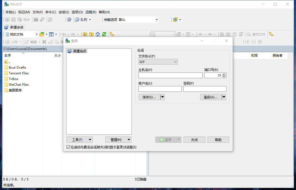 5.打开SSH工具,这里我用WinSCP(用什么工具就是个习惯,用其他工具也是可以的)SSH连接就选择SCP文件协议,主机名就是路由器后台的IP地址,用户名是root,密码就是背面的默认管理密码。