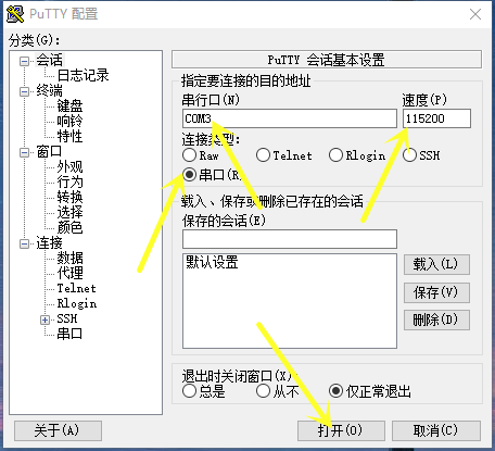 然后打开putty软件(你用其他串口工具也可以),先选择连接类型:串口