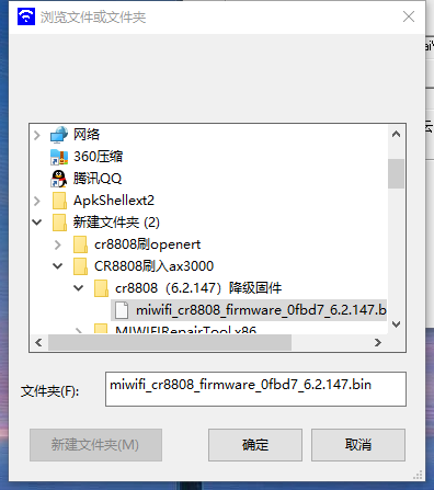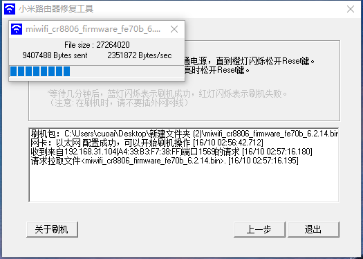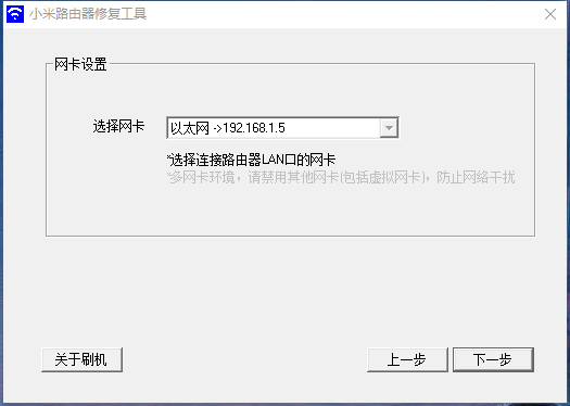 6.打开小米路由器修复工具(MIWIFIRepairTool.x86),点击浏览导入AX3000公版固件(miwifi_cr8808_firmware_9d216_6.2.11.bin),然后下一步选择操作电脑对应的网卡,然后下一步,这时候断开路由器电源,按住rese键,再接通电源,直到橙灯闪烁松开rese键。稍等几分钟,路由器蓝灯闪烁,则刷机成功,然后请断电重启路由器。