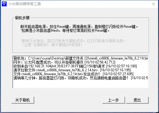 1.打开小米路由器修复工具(MIWIFIRepairTool.x86),点击浏览导入移动版降级固件(miwifi_cr8806_firmware_4622b_6.2.33.bin),然后下一步选择操作电脑对应的网卡,然后下一步,这时候断开路由器电源,按住rese键,再接通电源,直到橙灯闪烁松开rese键。稍等几分钟,路由器蓝灯闪烁,则刷机成功,然后请断电重启路由器。