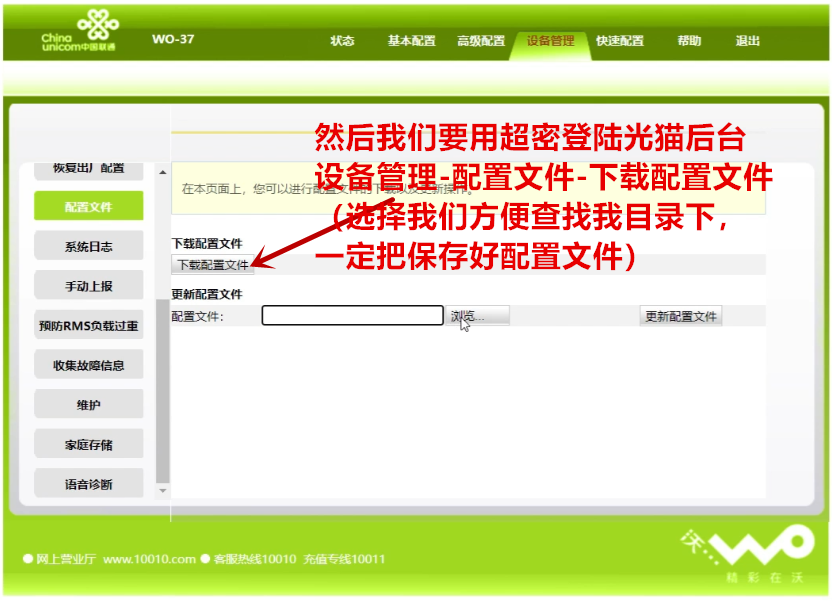 浏览器登录光猫后台,设备管理-配置文件,点击下载配置文件(见图)
