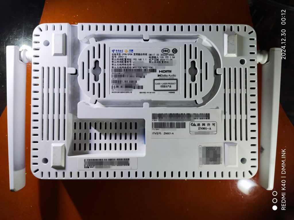 贵州群友发来一款电信版的(光口)宽带融合终端,型号为兆能ZN901-A,已经有半个多月了,电视盒子一侧早已经刷好,固件也很完美不掉三码流畅度也可以。只是光猫一侧电LAN口始终没能连接网络,反复试验了好多次,各种网络连接设置,都试验了好多遍,都没能正常连接网络。有一种连接连上网络的瞬间,也就几秒钟的时间就又断了,TR069删除了,设置也不行,我看后台有很多插件在运行,也不知道具体原因,所以此篇文章只做记录之用。
