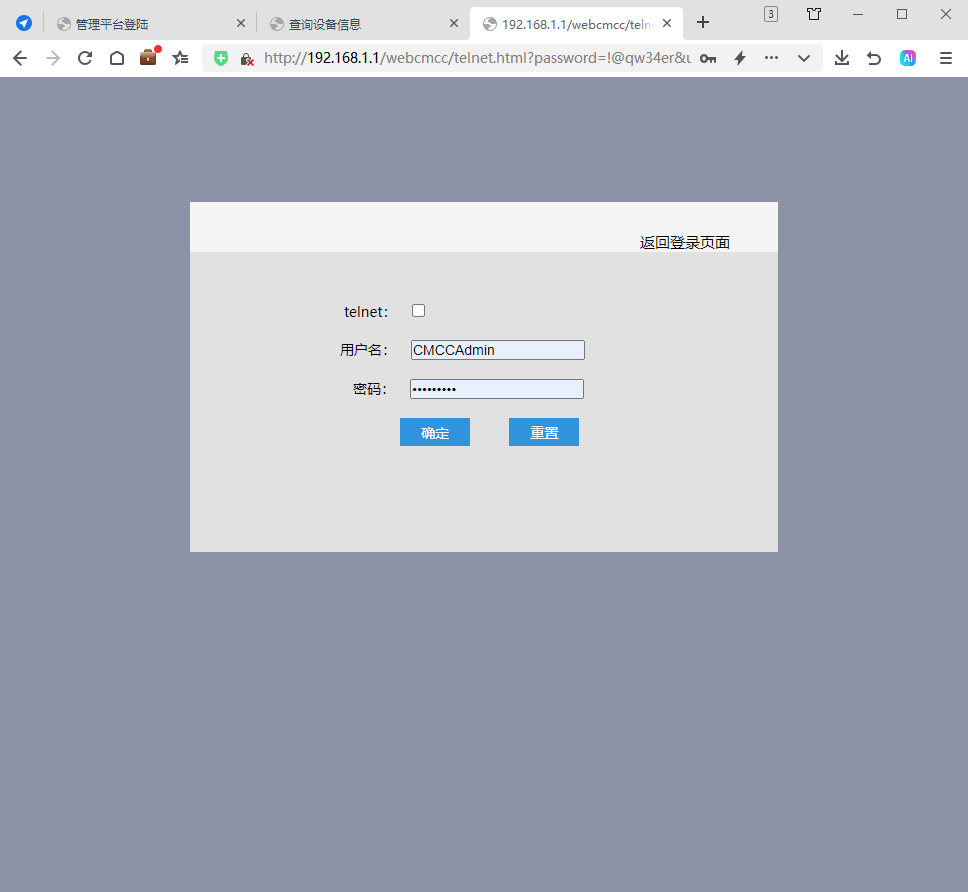 这个有着超级管理员权限的telnet的账号和密码是你开启telnet时候用的那一行网址里的账号和密码