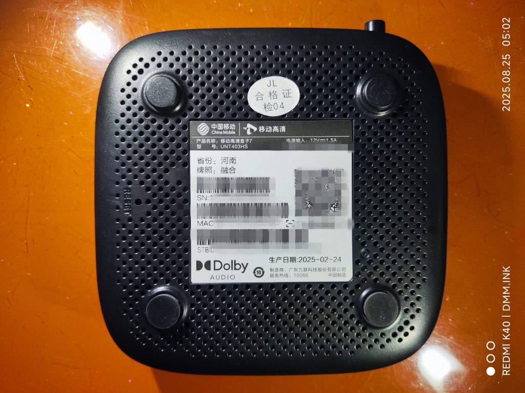 说一下今天这款:(河南移动)UNT403HS,具体配置:CPU芯片为:海思HI3798MV320,2G运存,8G的EMMC存储,只有单蓝牙芯片为XH9706-B。原系统安卓版本为9
