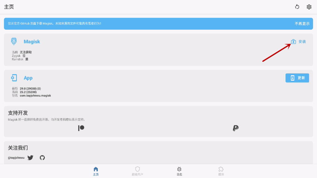 第五步:重启盒子,然后回到电视打开magisk查看,机顶盒被root成功了,已经有超级用户授权了