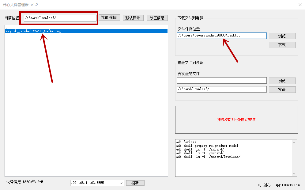 第四步:我们回到电脑,在开心助手文件管理,进入/sdcard/Download/找到magisk_patched-25200_XtiRH.img文件,右侧浏览,选择下载位置,点击下载。我这里就放到桌面了。