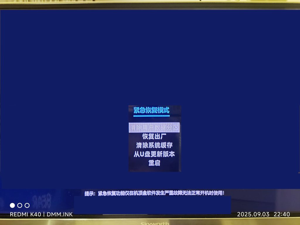 机顶盒将进行重启(屏幕突然变成黑色),立即将U盘插入靠近HDMI接口的U口