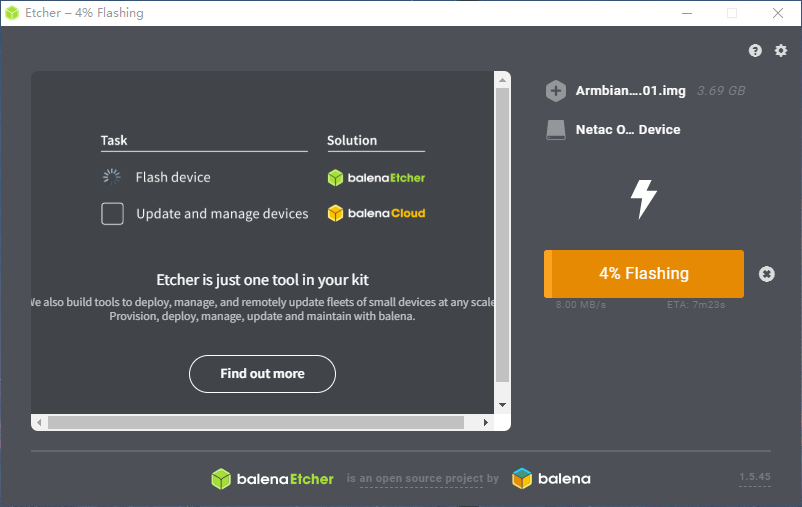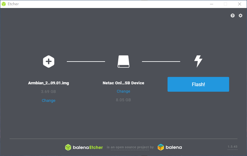 第七步:打开balenaEtcher.exe这个软件,选择我们刚下载的armbian固件(最好解压出img文件)然后选择U盘,注意不要选错,然后点击烧录