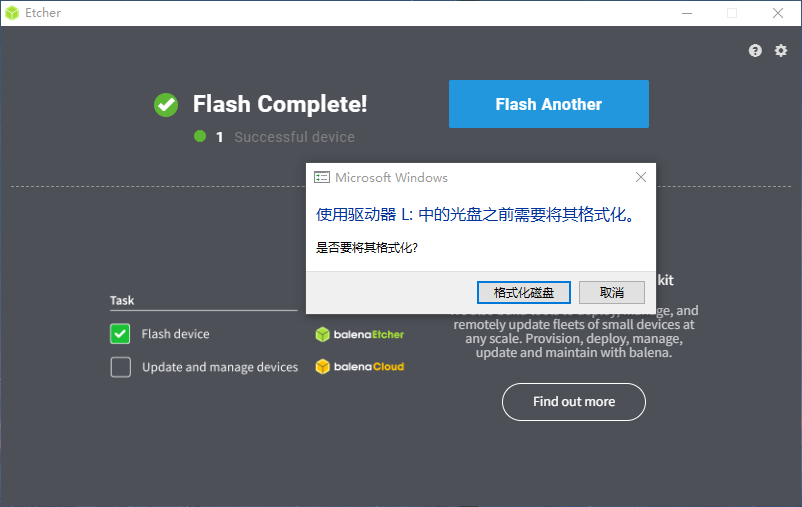 烧录完成以后,注意不要格式化,我们取消即可,然后拔下U盘