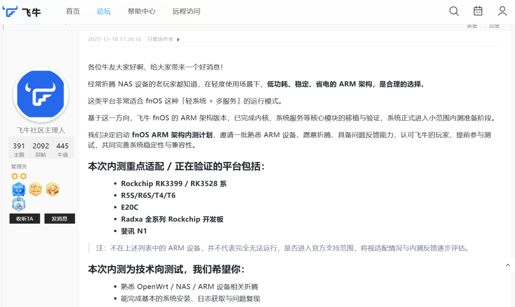 飞牛fnOS官方arm内测申请地址:https://club.fnnas.com/forum.php?mod=viewthread&tid=47789&highlight=