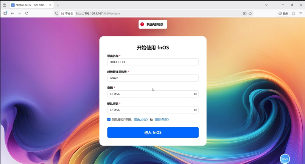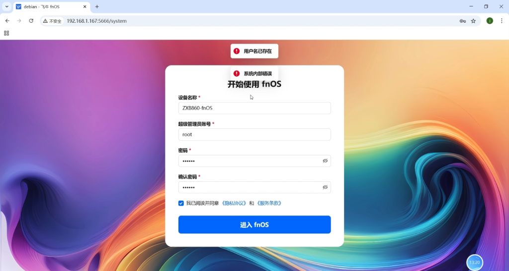 1.我们用浏览器输入设备的ip:5666登录飞牛OS后台,会让我们设置设备名称,超管账号和超管密码。(登录这个设置页面很漫长,差不多点有五分钟到十分钟,我用三个浏览器不停刷新才进入,看到网上说有bug,一共有三次差不点放弃,这是第一次)