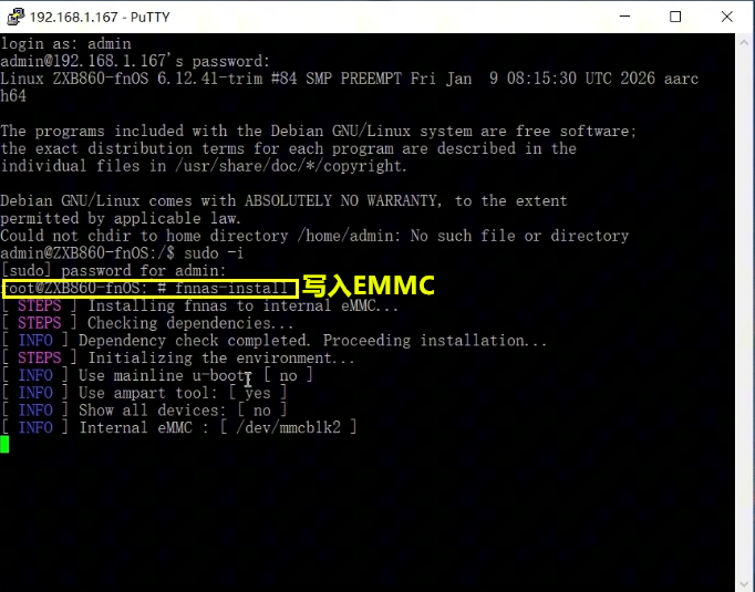 4.将U盘里的fnOS系统写入盒子EMMC。