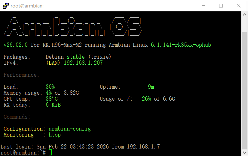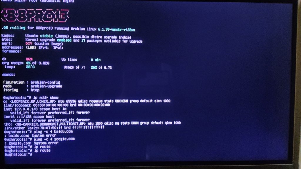 上面的三张图,第一张是路由器获取的armbian系统的ip地址。第二张是卡载系统启动以后电视上显示的代码,我用USB键盘和盒子上输入了账号和密码。第三张是我在电脑用putty进入卡载系统的SSH。