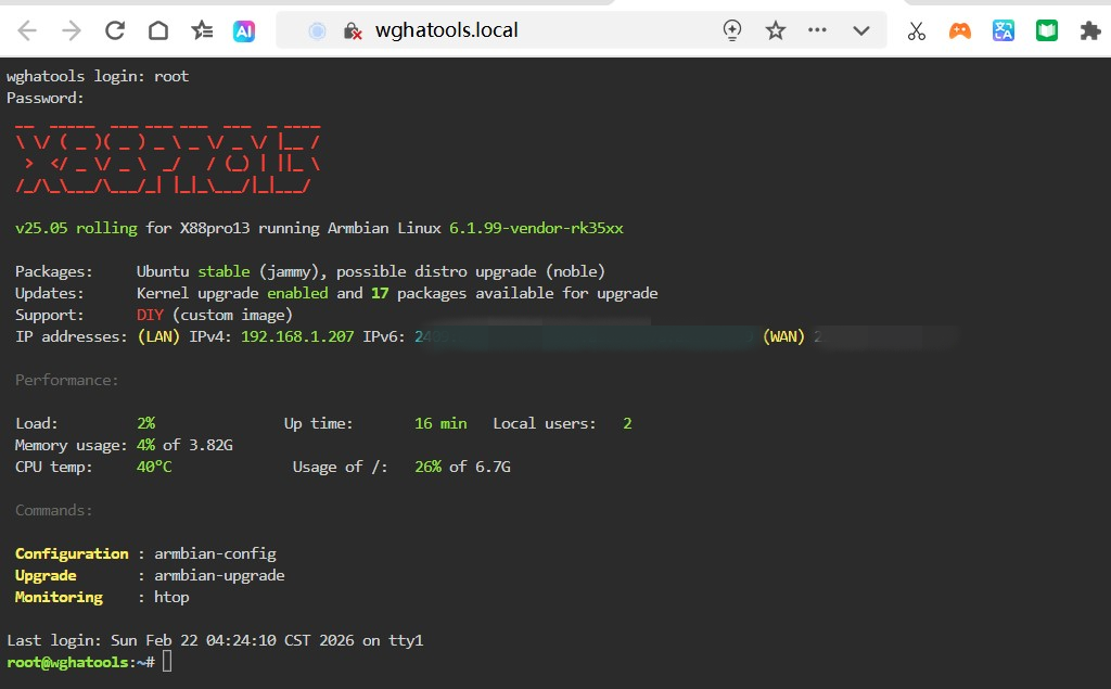烧写完成以后,冬瓜HAOS还提供了一个后台管理面板,方便我管理和使用。http://wghatools.local:8124/
