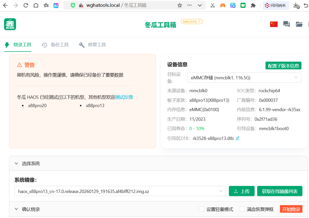 下图是http://wghatools.local:8122/我们就进入了冬瓜工具箱,方便我们刷入HomeAssistant系统。工具箱提供了对应的HomeAssistant固件,我们烧录就把HomeAssistant写入到emmc了。
