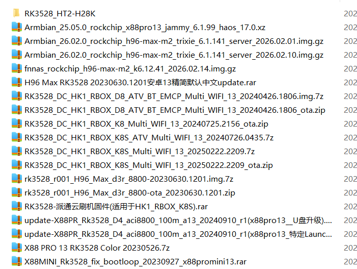 有群里的小伙伴告诉我,你的盒子有线网口是千兆的吧!开始我还真没在意,wifi芯片当时我考虑跑流量的盒子一般都不会去适配无线网卡的,这个属于正常,因为需要稳定。然后我又特别去找1000M的盒子固件,无奈全网没找到瑞芯微RK3528A标记1000M的安卓固件。标记1000M的瑞芯微RK3528A的固件只找到“HT2和H28K”,刷是正常刷进去了,但是点不亮。下面是我所收集固件的图片