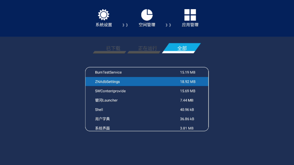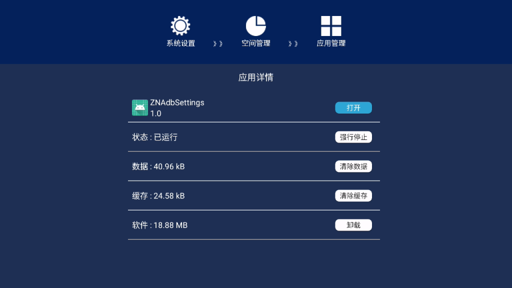 开这款盒子需要一个ZNAdbSe__ngs_1.0.apk(固件包里有提供),是一个开启设置ADB的软件。把ZNAdbSe__ngs_1.0.apk复制到U盘里插到盒子上,遥控器链接蓝牙(最新款的移动蓝牙语音遥控器,我用老款的语音遥控器,能搜索到,但连接不上)然后按住遥控器的语音功能键,对着遥控器说:文件管理,就打开了盒子的文件管理器,然后进到U盘里直接用遥控器点 ZNAdbSe__ngs_1.0.apk一闪就安装完了(多点几次确定,一次可能装不上)。安装好之后点遥控器上的设置按钮,然后一直向下找到空间管理—应用管理—全部应用,然后一直按下,在应用列表里找到 “ZNAdbSeting ”点击打开,然后点最上面的打开,进到ZNAdbSeting界面后,用遥控器把两个选项都打上对勾。这时盒子应该就已经打开ADB模式了