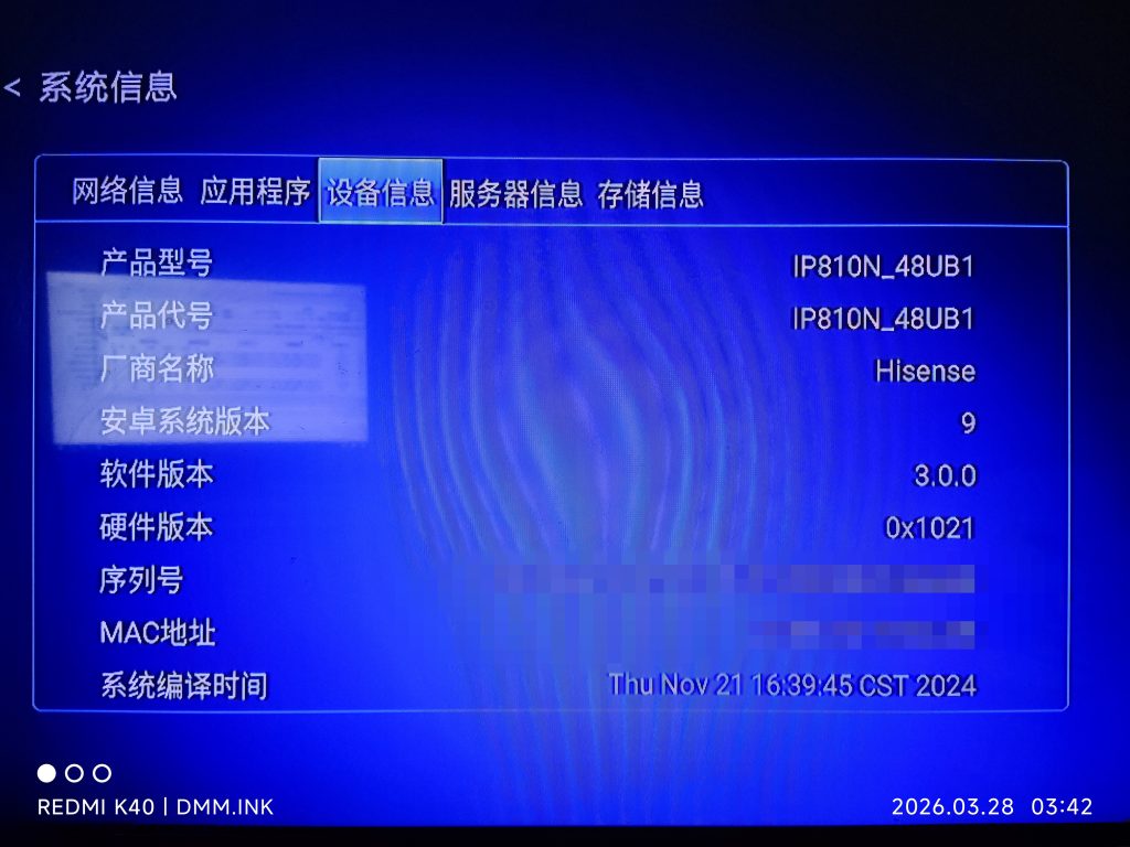 说一下今天这款:(河南联通)海信IP810N_48UB1,具体配置:CPU芯片为:海思HI3798MV320,2G运存,8G的EMMC存储,只有单蓝牙芯片为XDT8801。原系统安卓版本为9